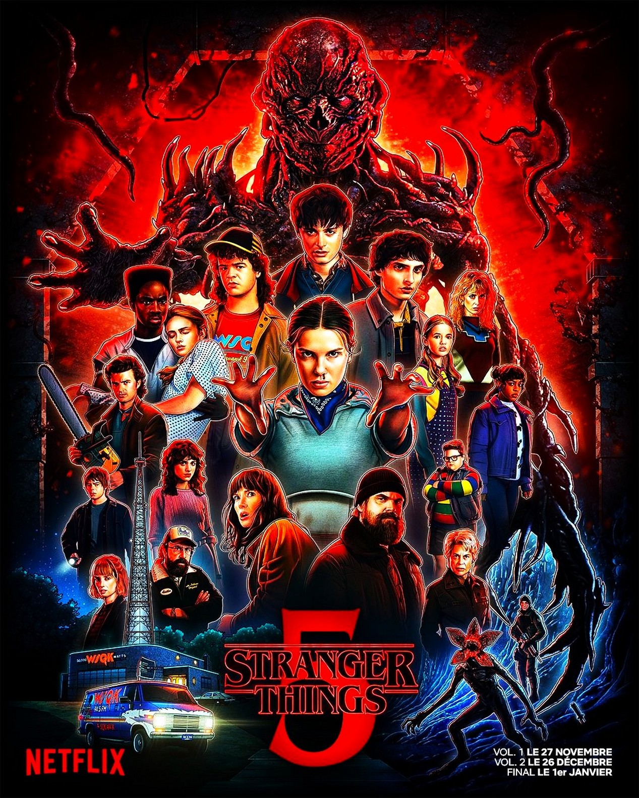 De son côté, Luke Morris — autre spectateur chanceux — a lui aussi encensé ce premier épisode, le décrivant comme « dynamique, grandiose et terrifiant ». Il ajoute même : « Si toute la saison suit cette première heure, ils auront vraiment réussi leur coup. » S’il est vrai que Stranger Things a parfois divisé ses fans au fil des saisons, l’enthousiasme actuel (certes restreint au moment où sont rédigées les présentes lignes) semble unanime et les déclarations fusent : si la série parvient à offrir une conclusion à la hauteur, elle pourrait bien « entrer dans l’histoire des meilleures séries télévisées de tous les temps ». Cette cinquième et ultime saison marque le retour de nombreuses figures emblématiques : Winona Ryder, David Harbour, Finn Wolfhard, Millie Bobby Brown, Gaten Matarazzo, Caleb McLaughlin, Noah Schnapp, Sadie Sink, Natalia Dyer, Charlie Heaton, Joe Keery, Maya Hawke, Priah Ferguson, Brett Gelman, Cara Buono et Jamie Campbell Bower. Et une nouvelle venue fait également sensation : Linda Hamilton, icône de Terminator, rejoint la distribution dans la peau de la redoutable Dr Kay. La saison 5 de Stranger Things arrivera sur Netflix en trois parties (dates visibles sur l’affiche ci-dessous). La fin est en approche… et tout indique qu’elle pourrait être mémorable.